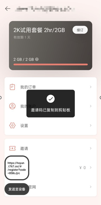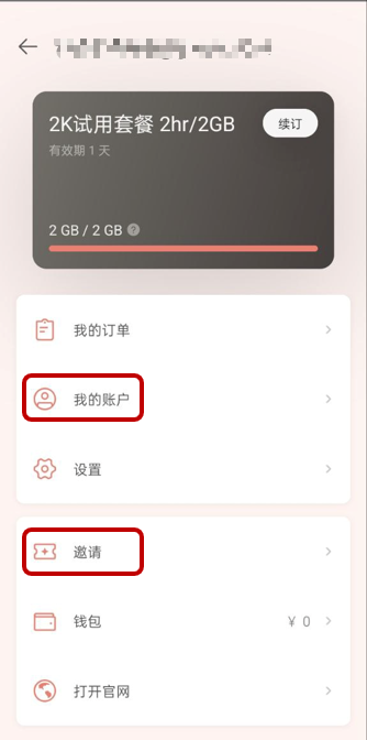 【我的订单】可看到您过往的历史订单。 【我的账户】可退出登录及修改密码。 【邀请】将复制您的个人邀请码,可分享火烧云给您的好友,获得免费时长。→ 关于 推荐奖励制度