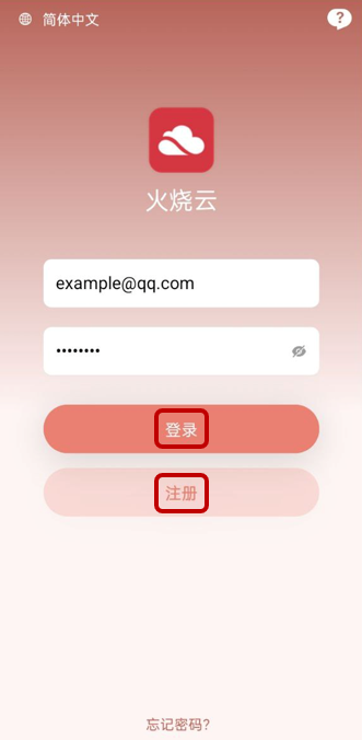 2. 输入您的火烧云账号及密码,点击【登录】。若尚未注册,请点选【注册】,输入邮箱后点击【发送】验证码。