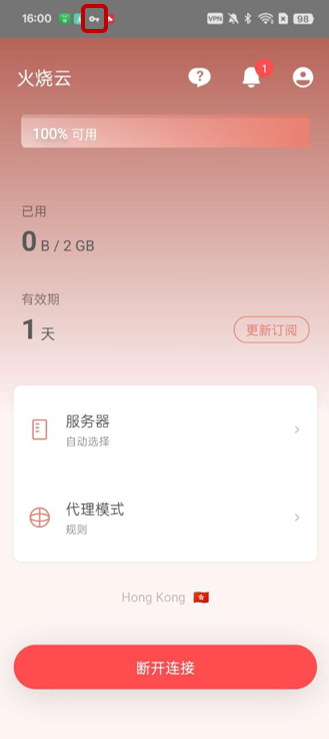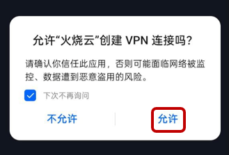 初次使用请同意网络连接请求权限。正确授权并开始运行时,顶部会显示钥匙或 VPN 符号。