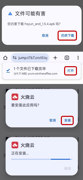 1. 点击链接下载 APK 文件。点击【仍然下载】,并且【打开】下载好的文件,允许安装。(无须理会系统警告)