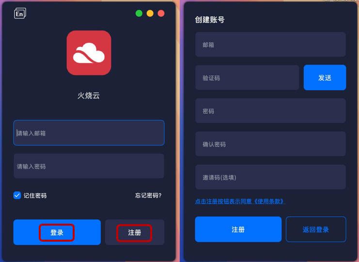 4. 此时即可开启火烧云应用软件,输入邮箱及密码,点击登即可使用。若尚未拥有火烧云会员,请点选【注册】。