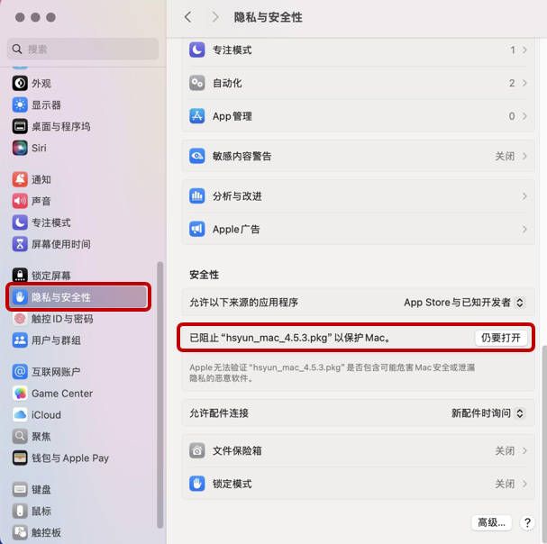 2. 打开「系统设置」,找到「隐私与安全性」内的「安全性:允许以下来源的应用程序」,并选择【仍要打开】。