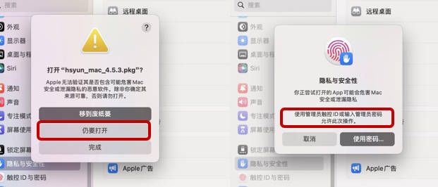 → 解决方法:请在下载火烧云客户端安装用pkg文件后,不要选取【移到废纸篓】,先至【系统设置】的【隐私与安全性】允许安装。。