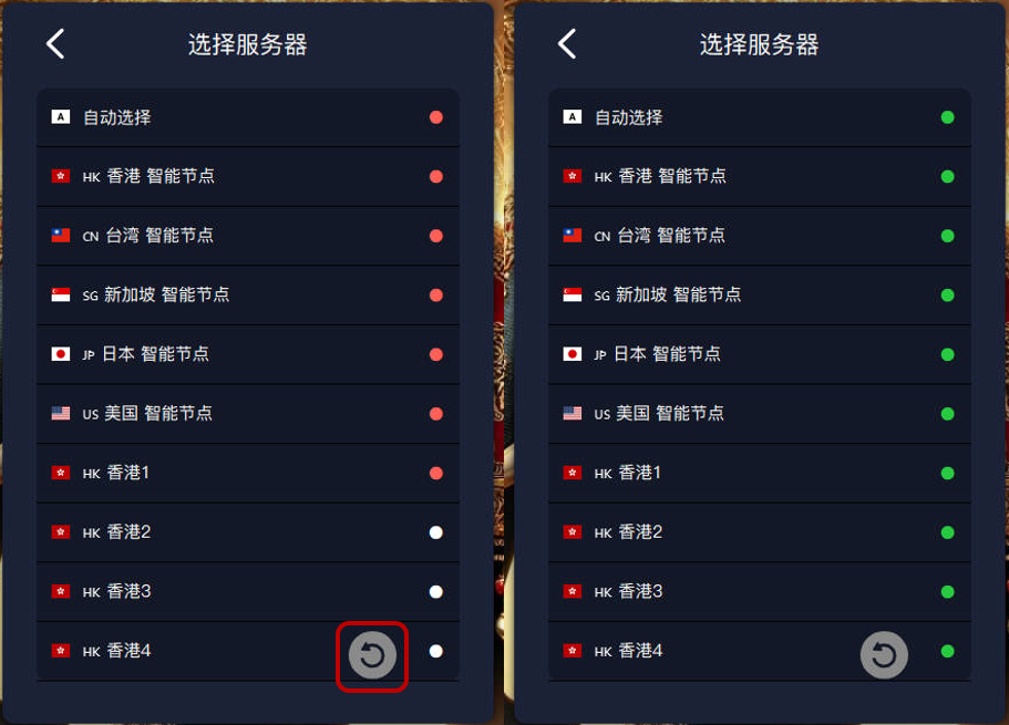 10. 点击服务器内的【循环箭头】符号,可刷新节点延迟。