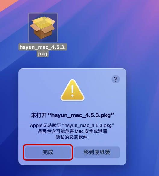 点击安装时若提示「Apple无法验证…移到废纸篓」时,请先点选【完成】。