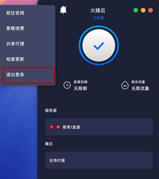 11. 点击左上菜单,即可前往【套餐续费】及【退出登录】。