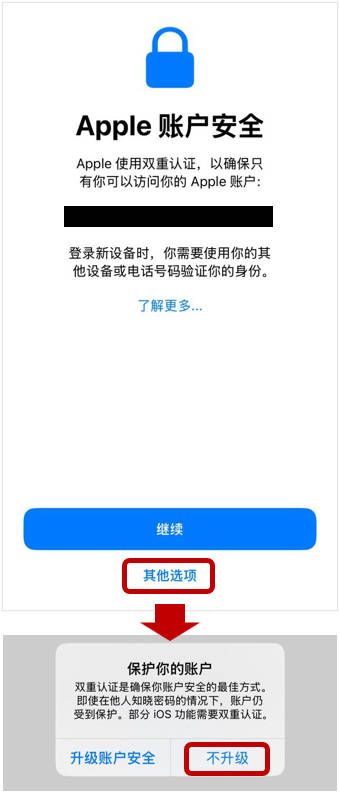 如果系统提示升级到「双重认证」,务必选择「其他选项」>「不升级」。