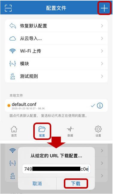 回到 Shadowrocket 小火箭的【配置】页面,点击右上角【+】,于栏位中帖上复制成功的订阅链接,点选【下载】导入节点,您将在 Shadowrocket 应用首页看到加入的火烧云节点。选择任一节点,点击顶部开关。