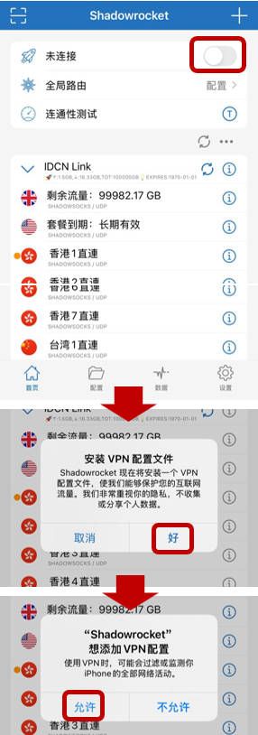 选择任一节点,点击顶部【未连接】开关。 系统将提示您安装并添加 VPN 配置,请点击【好】后点击【允许】,手机将跳转至「设置」应用,按指示验证您的手机开机密码。