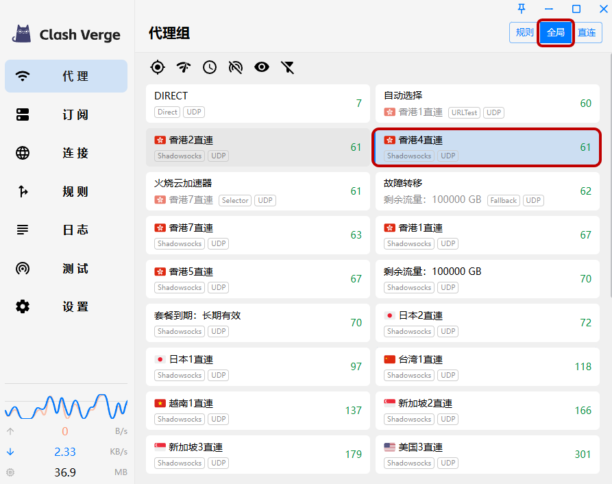 ⚠️ 連接時,请将代理模式切换至【全局模式】,并使用延迟小的节点