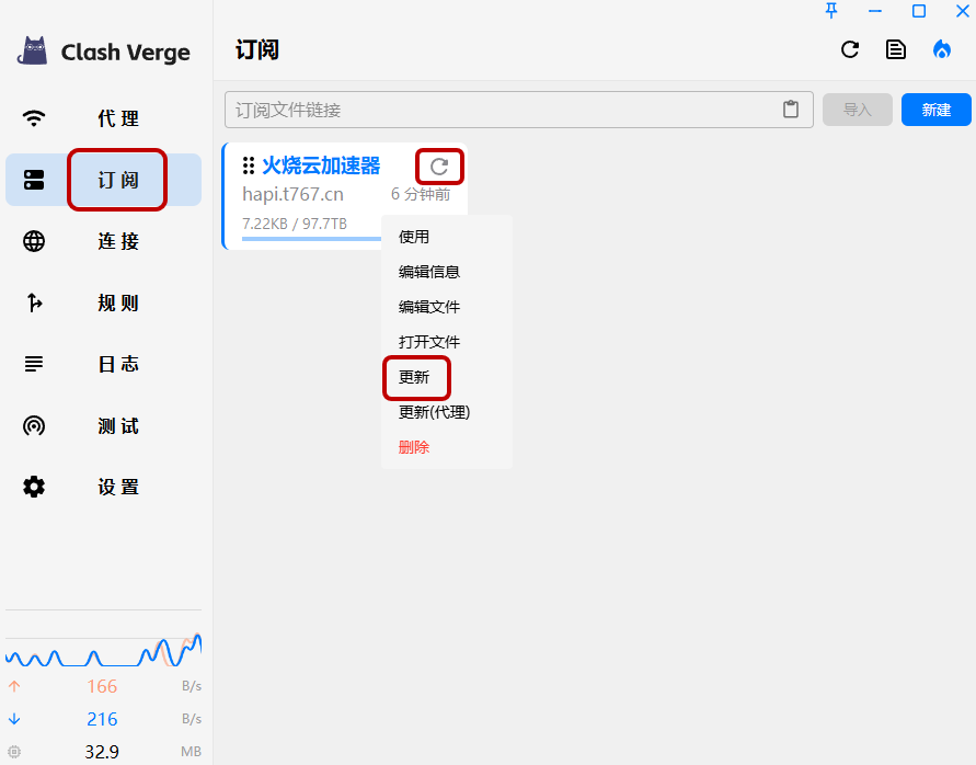 至【订阅】,在火烧云加速器右上角点击刷新,或点击右键选取【更新】