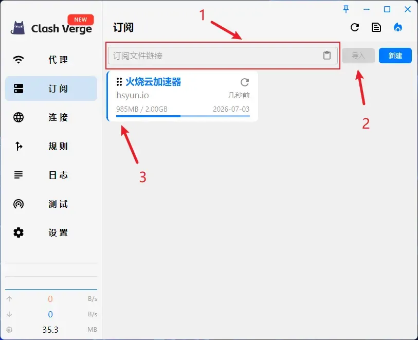 回到 Clash Verge的【订阅】页面,将订阅地址粘贴到【订阅文件链接】,点击「导入」,再点击出现的「火烧云加速器」以启动节点。