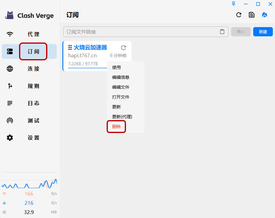 至【订阅】,火烧云加速器上点击右键,选取【删除】。
