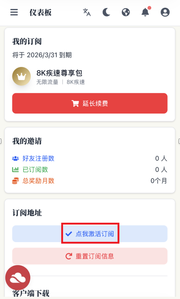 → 解决方法:请至官网,回到【仪表盘】,点击【激活订阅】并【复制订阅链接】后再次尝试导入