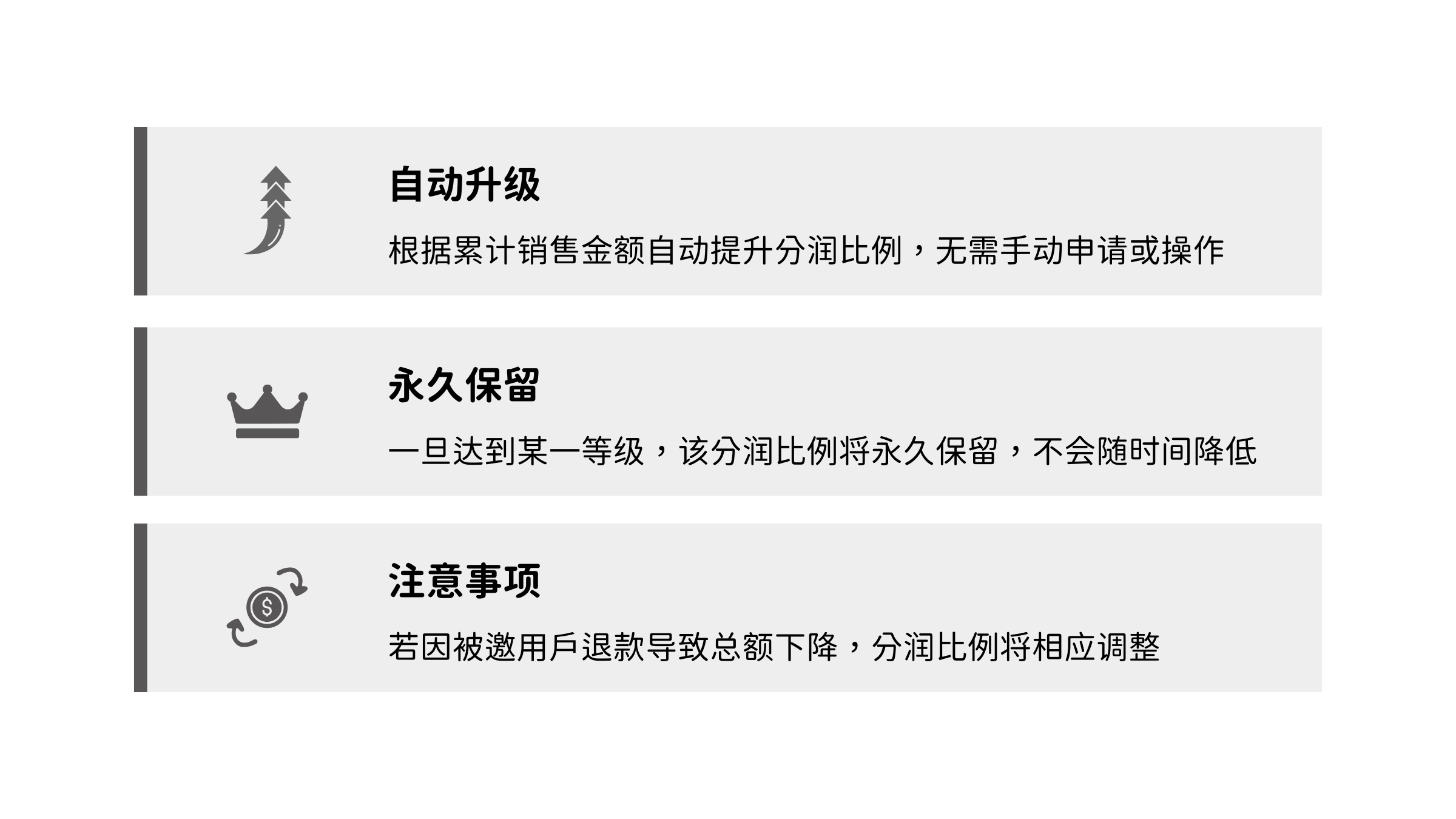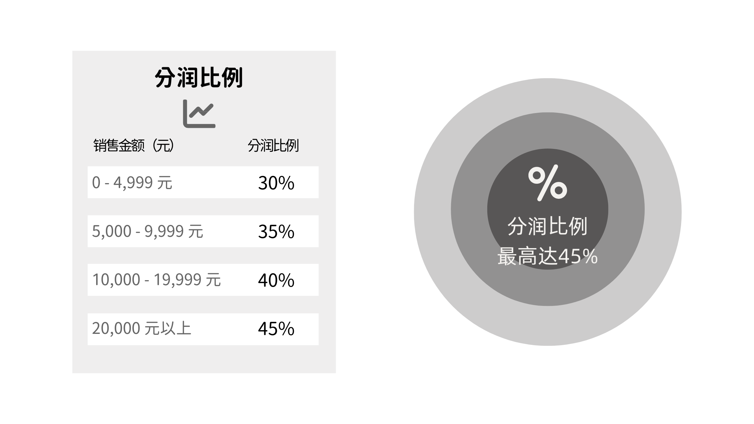火燒云佣金代理制度采用分级提成的销售分润机制,根据您的累计销售业绩自动提升分润比例。