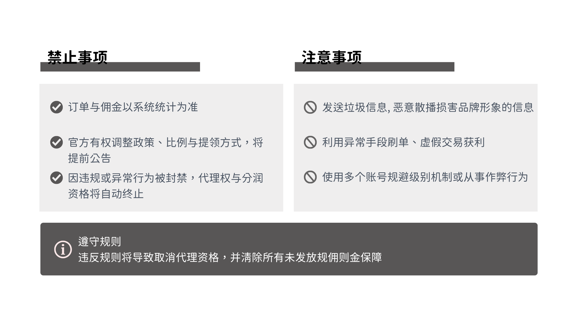 为保障代理合作的公平性与合规性,请务必了解以下规定: