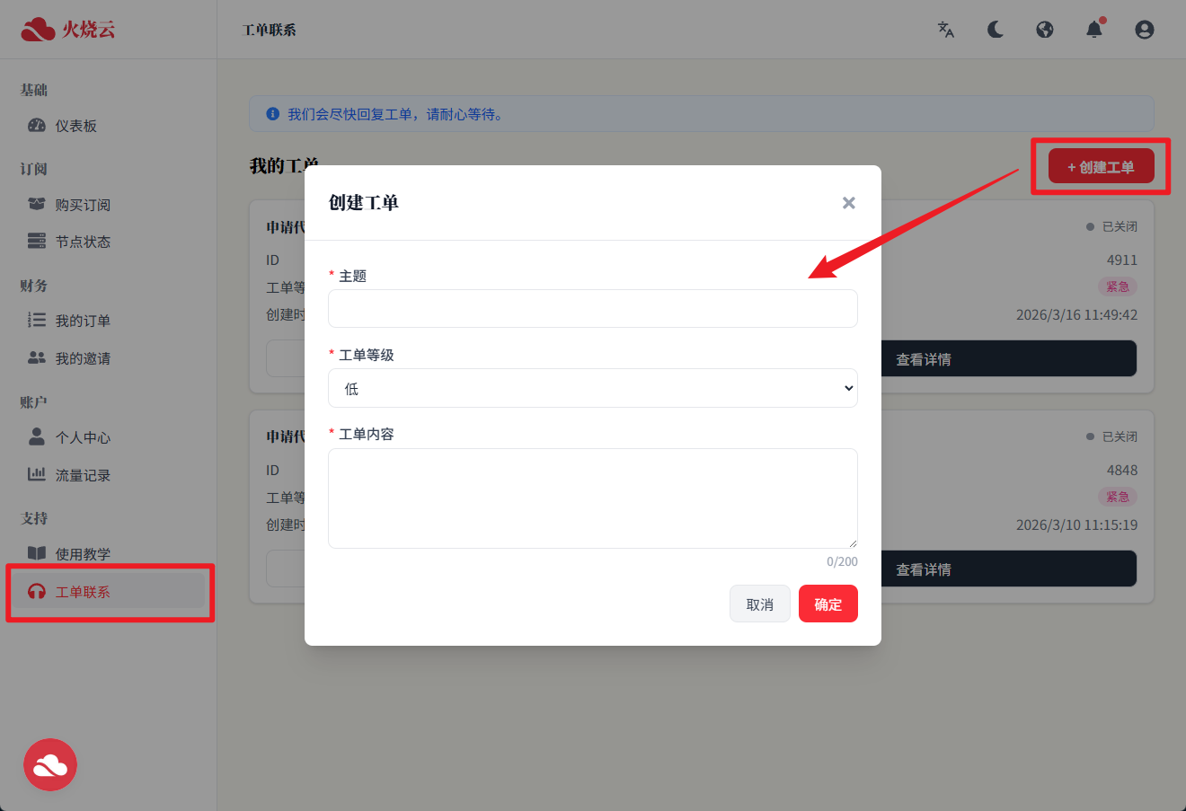 请访问 火烧云官方网站 ,找到【工单联系】>【创建工单】。