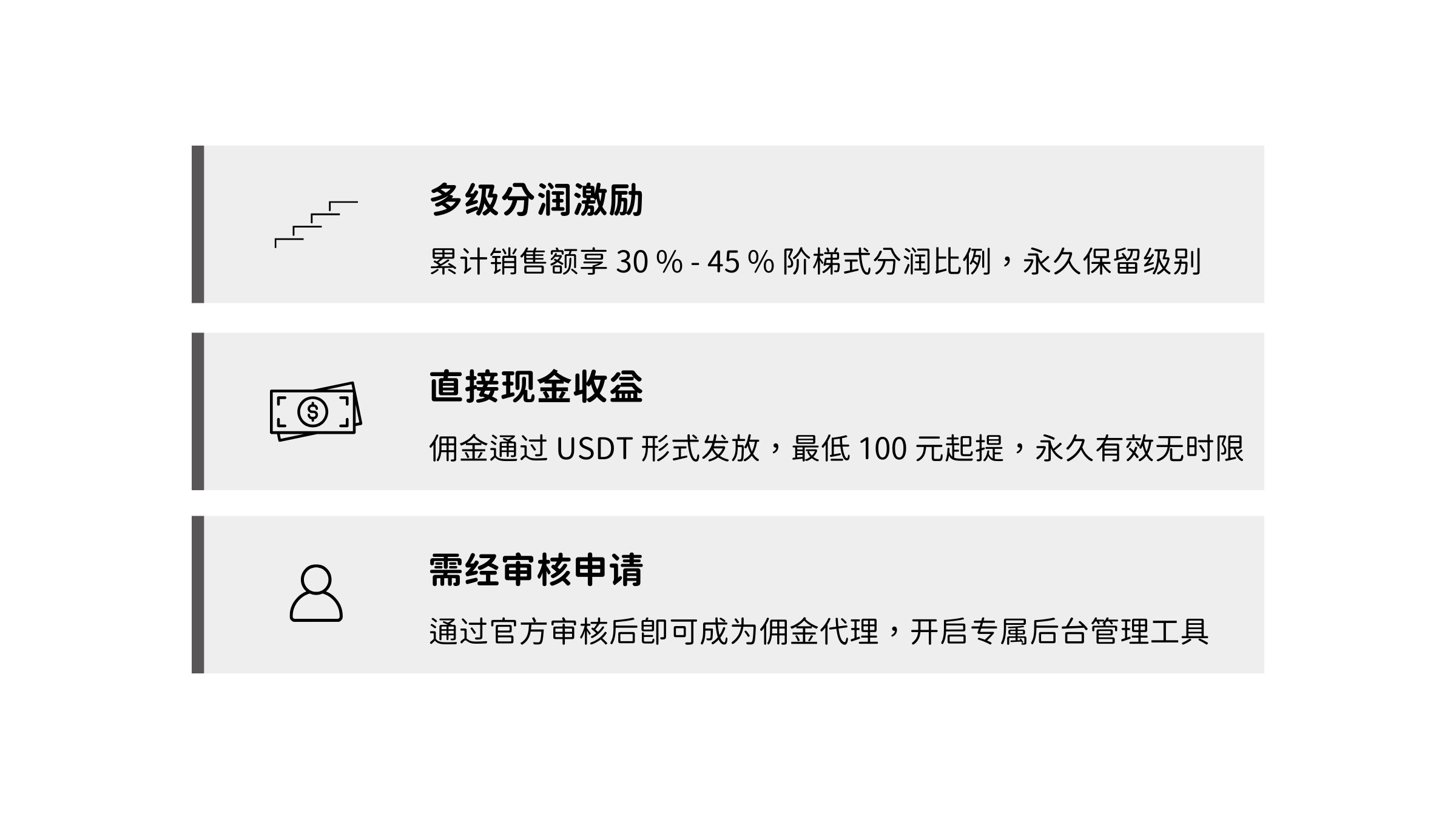 火燒云佣金代理制度采用阶梯式分润比例,根据累计销售额自动提升比例:
