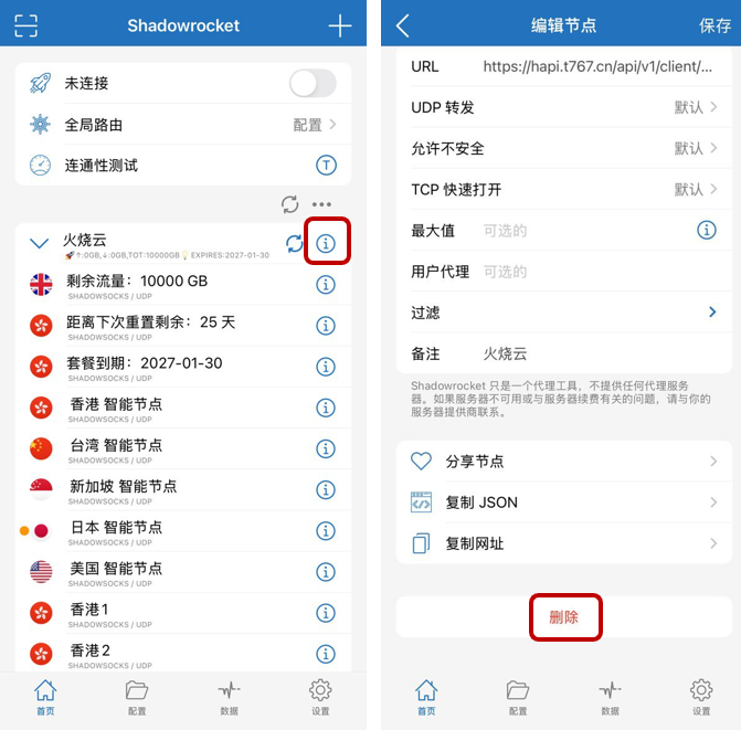 Windows 及 Mac 的 Clash Verge 版本,可在【订阅】页面找到; Android 的 Clash Meta 可在【配置】下找到; iOS 的 Shadowrocket 小火箭,可在【首页】的火烧云加速器【i】信息页内找到。