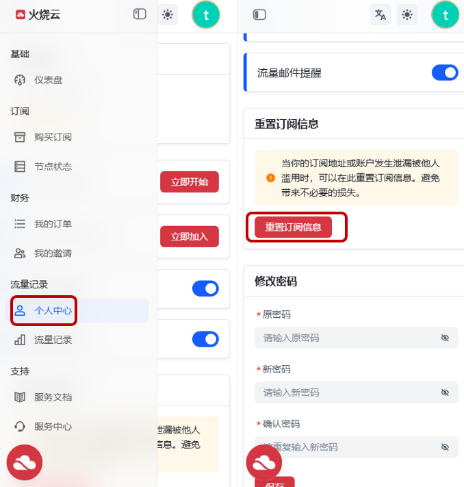 在 官网 菜单栏找到【个人中心】,点击【重置订阅信息】。