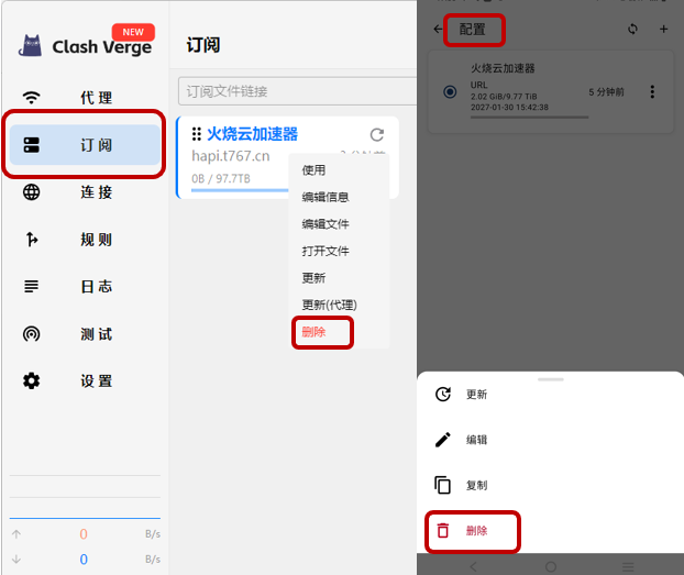 1. 至您的通用客户端,删除现有的火烧云加速器